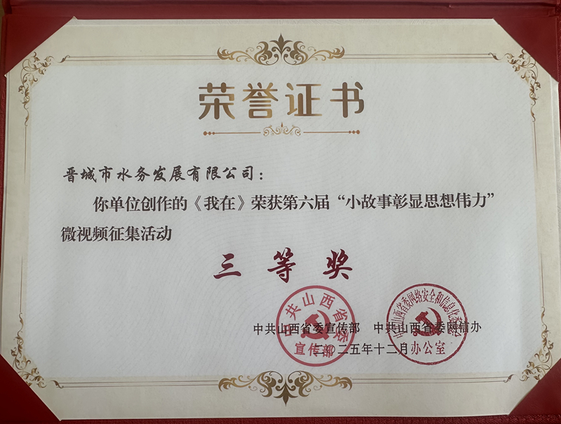 2025年10月,晉城市水務(wù)發(fā)展有限公司參加由中共山西省委宣傳部、中共山西省委網(wǎng)信辦聯(lián)合舉辦的第六屆山西省“小故事彰顯思想偉力”微視頻征集活動,作品《我在》榮獲三等獎。