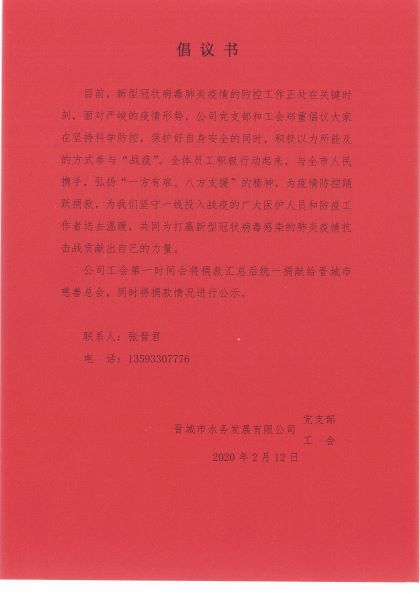 我公司黨支部成立“疫情防控志愿者服務(wù)隊”,配合公司所在社區(qū)進行登記、管控、摸排等工作。不僅如此,公司黨支部和工會還聯(lián)合發(fā)出倡議書,鼓勵全體員工積極為一線抗疫捐款,員工們積極響應(yīng),紛紛踴躍捐款,截止目前我公司共收到員工捐款10100元,工會有關(guān)人員已第一時間將員工捐款匯總并送至慈善總會。
