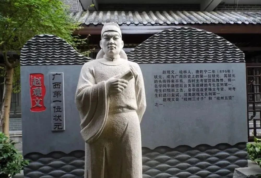 唐昭宗乾寧二年(895),這時歷史已經(jīng)進入到唐末,貞觀之治的欣欣向榮與開元盛世的繁華奢靡已成為遙遠的夢幻。安史之亂帶來的宦官專權,外蕃割據(jù)的混亂局面到此時達到了頂峰,生于斯、長于斯的趙觀文滿腹的詩書經(jīng)綸,滿腔的報國熱情終將成為明日黃花,最后激流勇退,老守田園。然而他的狀元功名的取得卻激勵了更多的廣西學子,帶動了廣西文化的發(fā)展;他清廉不阿的品德,被后人所敬仰,并成為廣西官員學習和效仿的典范。他去世后,人們建“五賢祠”來紀念他,將他與同時代的桂林陽朔詩人曹鄴、臨桂詩人曹唐并稱為“桂州三才子”。